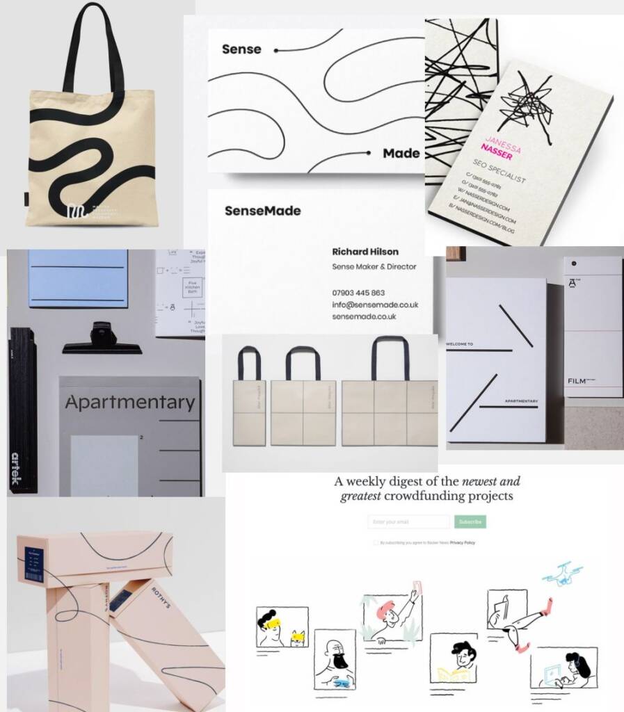 This style incorporates both straight and curved lines, geometric shapes, and freehand drawing. A recognizable feature is the absence of shadows or volumetric fills.